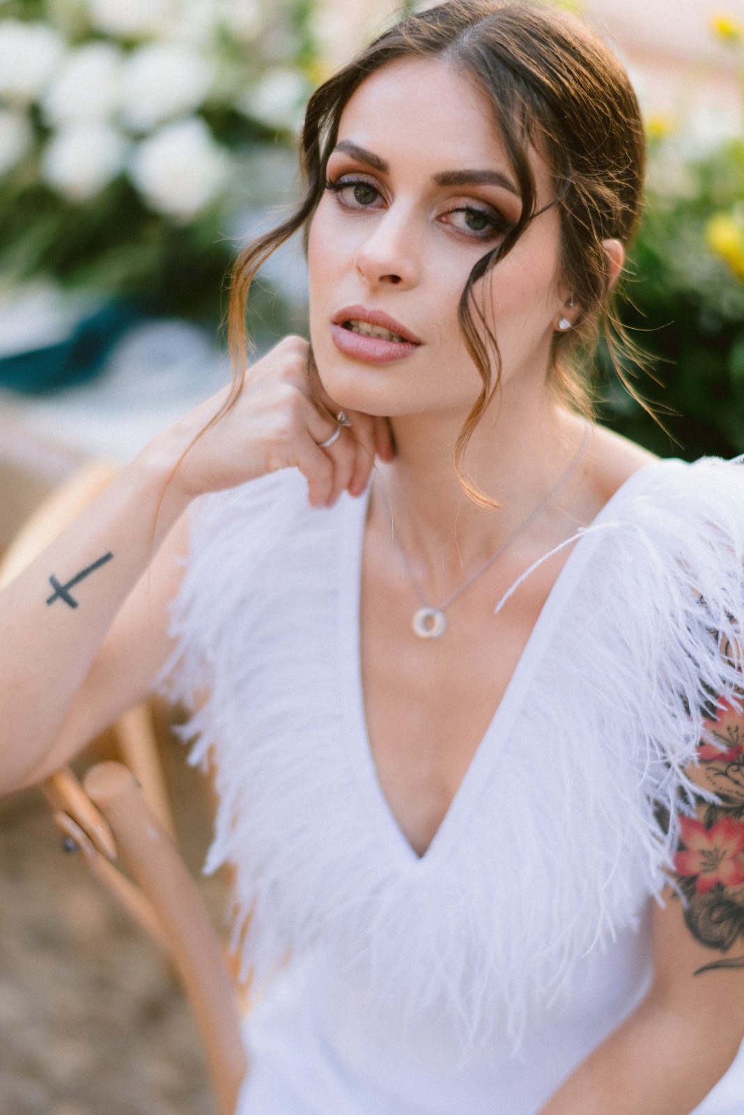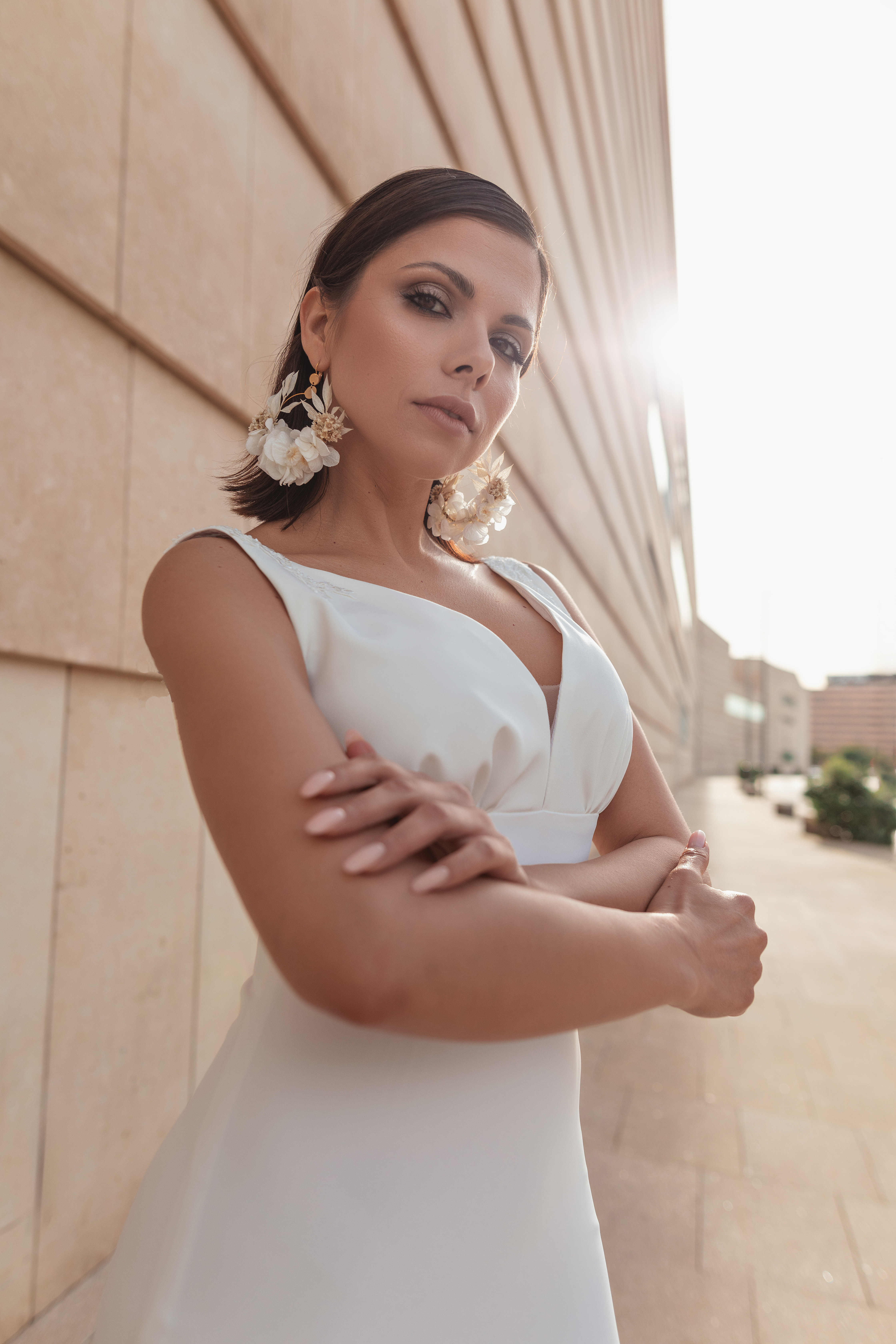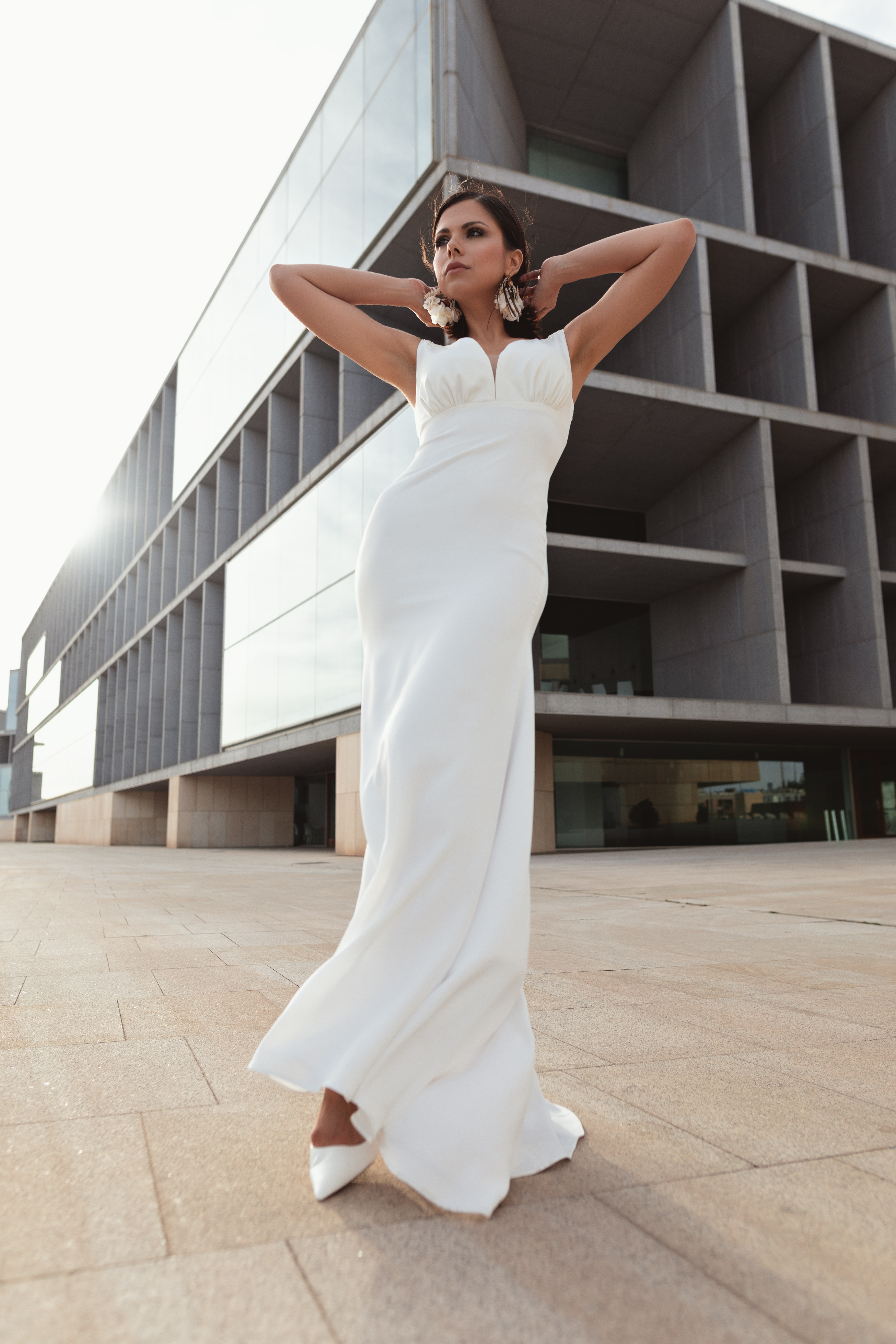 Vestido de novia en crepé blanco con escote en pico frontal y trasero, enmarcado por plumas que aportan textura y estilo. La falda amplia y ligera cae con movimiento natural y termina en una cola sutil. Un diseño actual, elegante y con mucha actitud. Ideal para novias que buscan un estilo actual, minimalista y con detalles únicos que marcan la diferencia.
