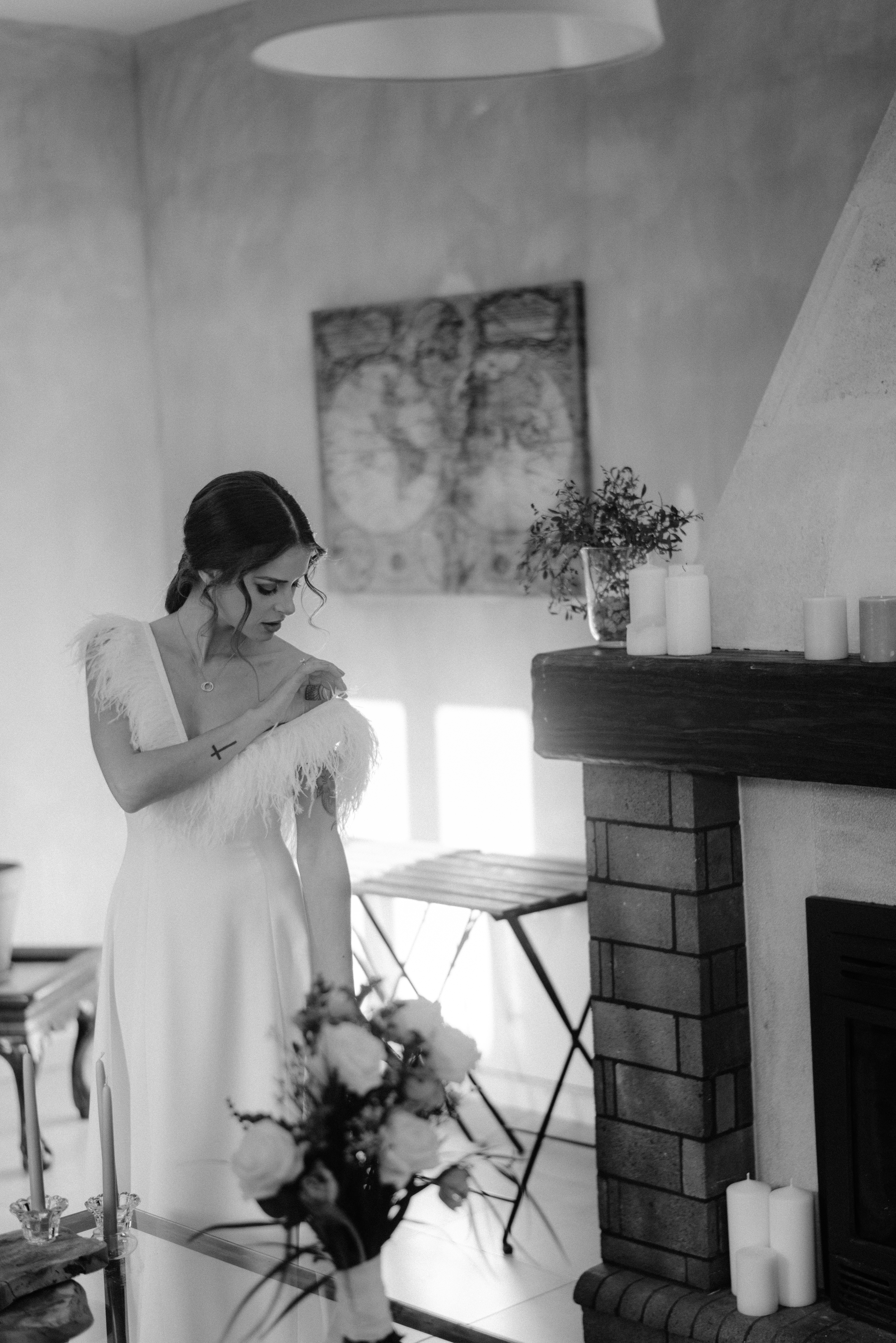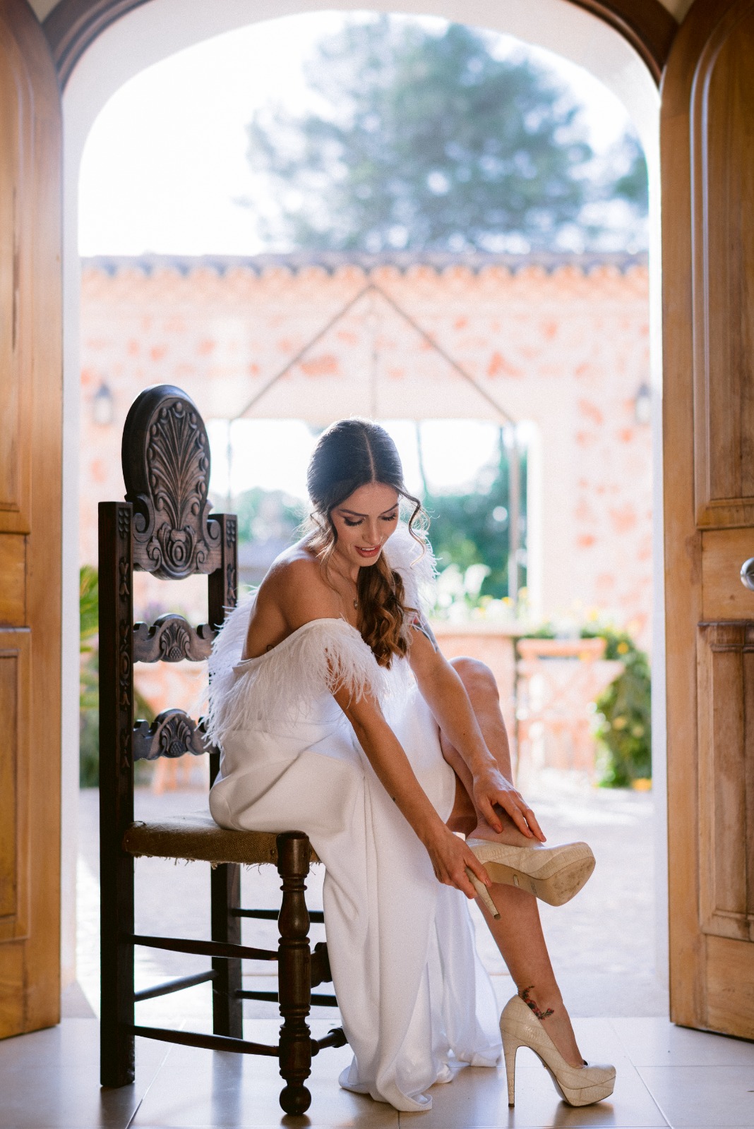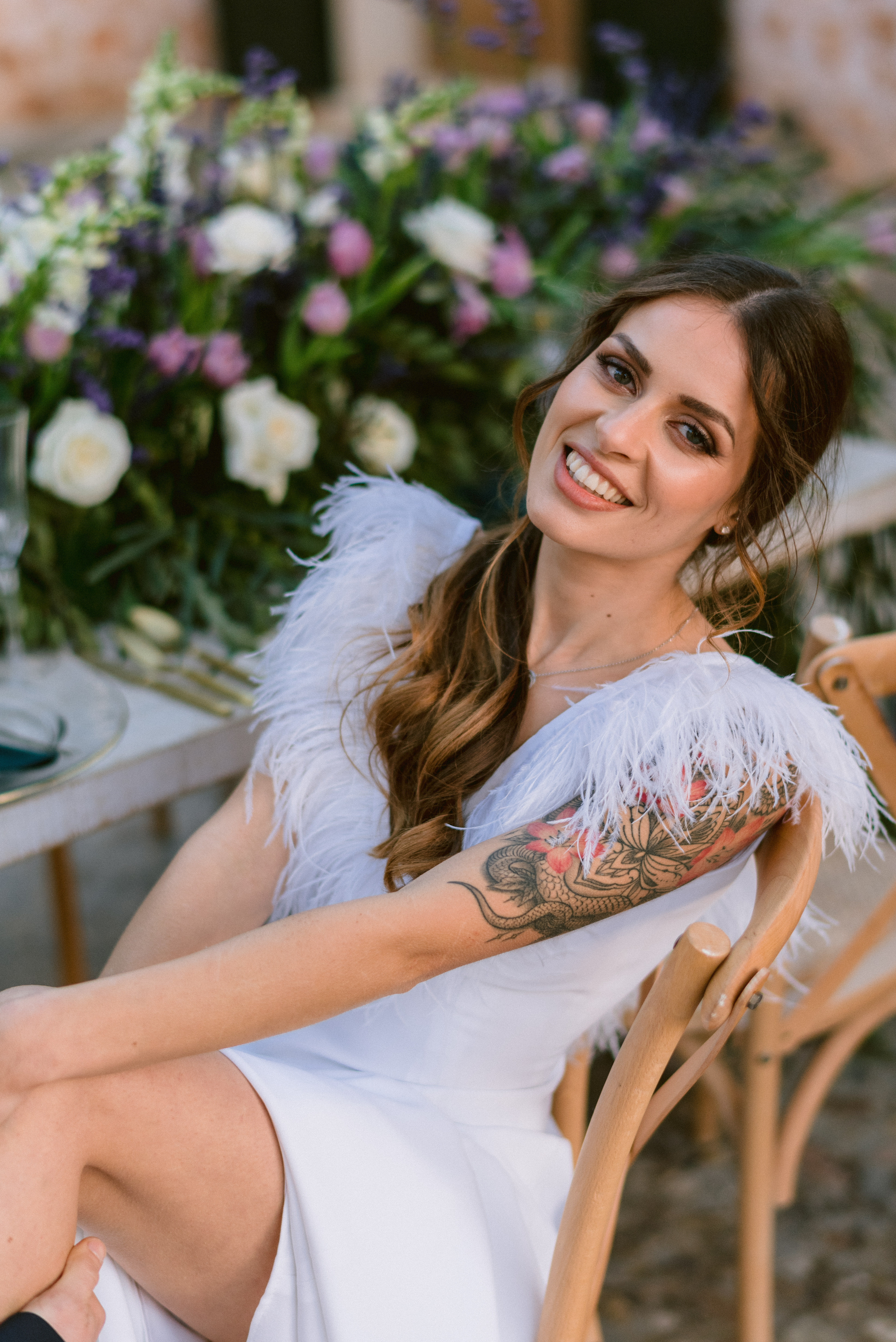 Vestido de novia en crepé blanco con escote en pico frontal y trasero, enmarcado por plumas que aportan textura y estilo. La falda amplia y ligera cae con movimiento natural y termina en una cola sutil. Un diseño actual, elegante y con mucha actitud. Ideal para novias que buscan un estilo actual, minimalista y con detalles únicos que marcan la diferencia.