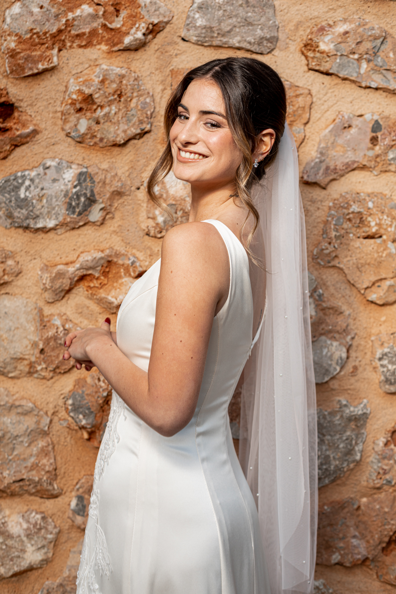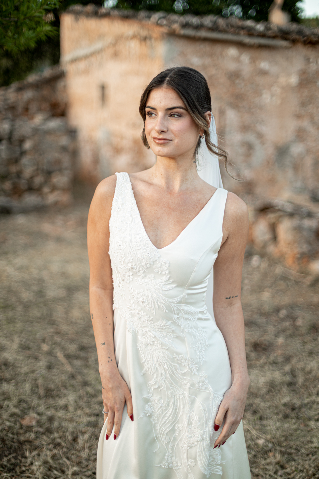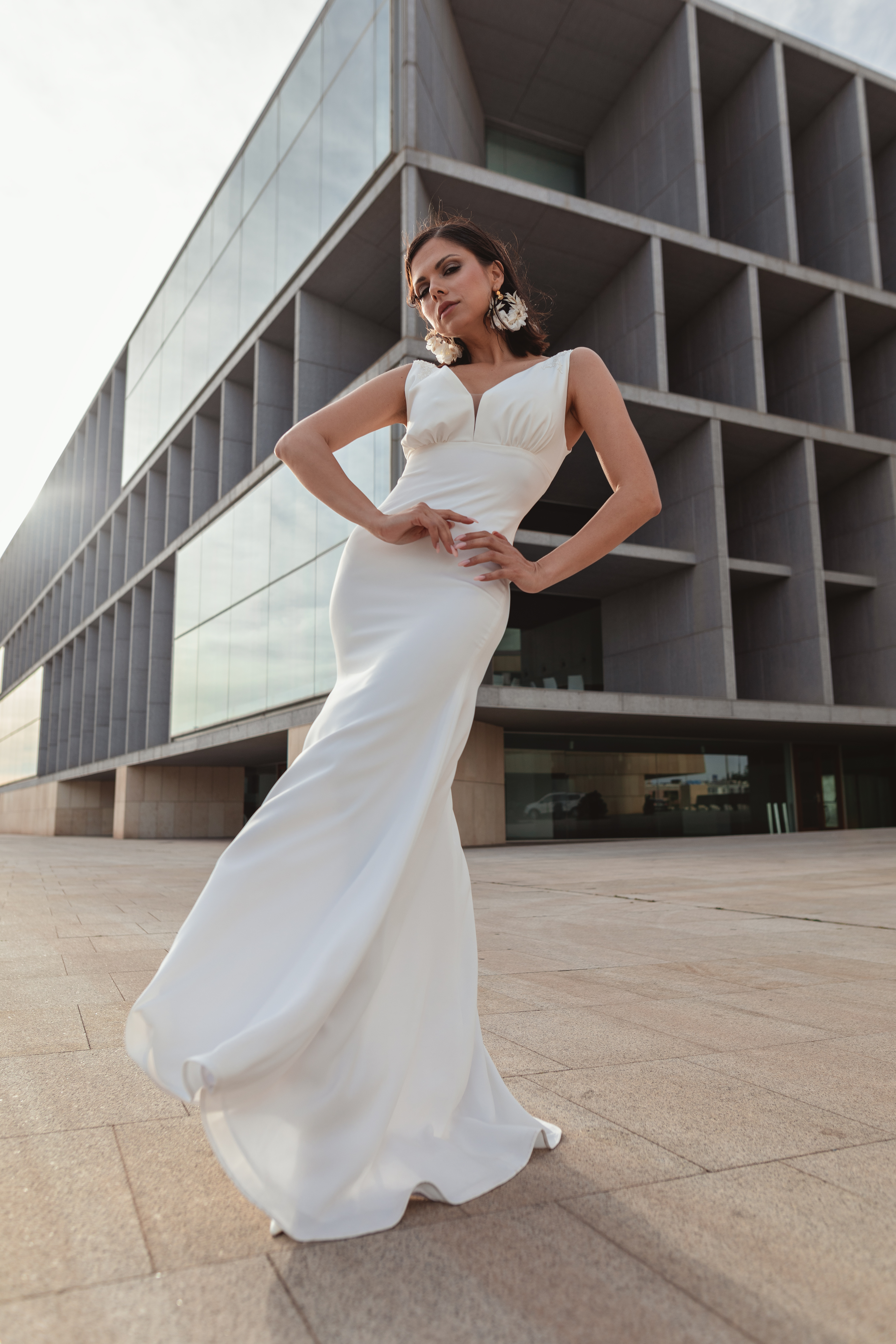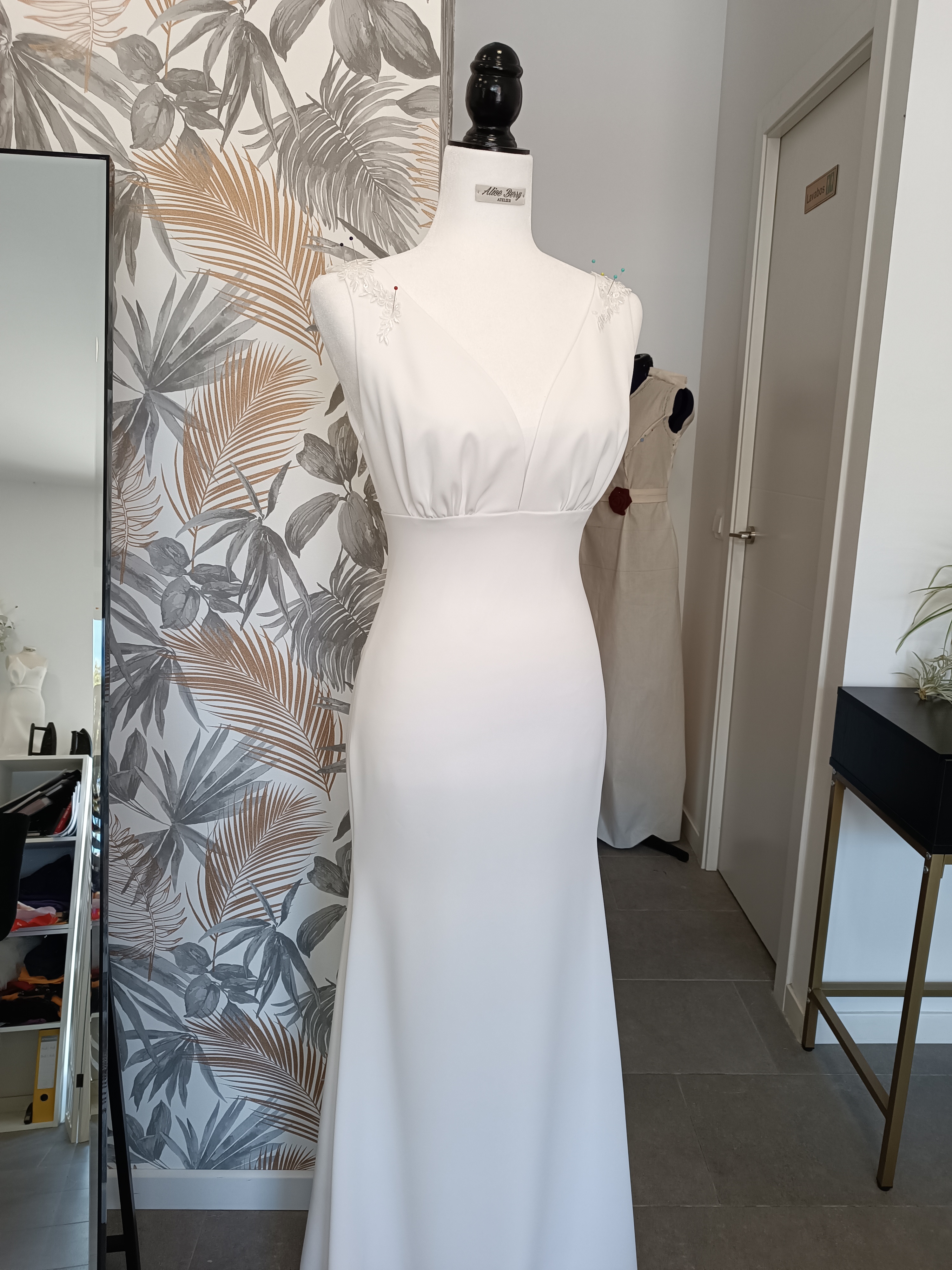 Vestido de novia en crepé suave con silueta sirena y cola corta, pensado para resaltar la elegancia natural. El escote en pico, delantero y trasero, aporta sofisticación atemporal. Los hombros se adornan con encaje de pedrería finamente bordado a mano, añadiendo un destello de lujo artesanal. Una elección impecable para novias que buscan distinción y refinamiento absoluto.