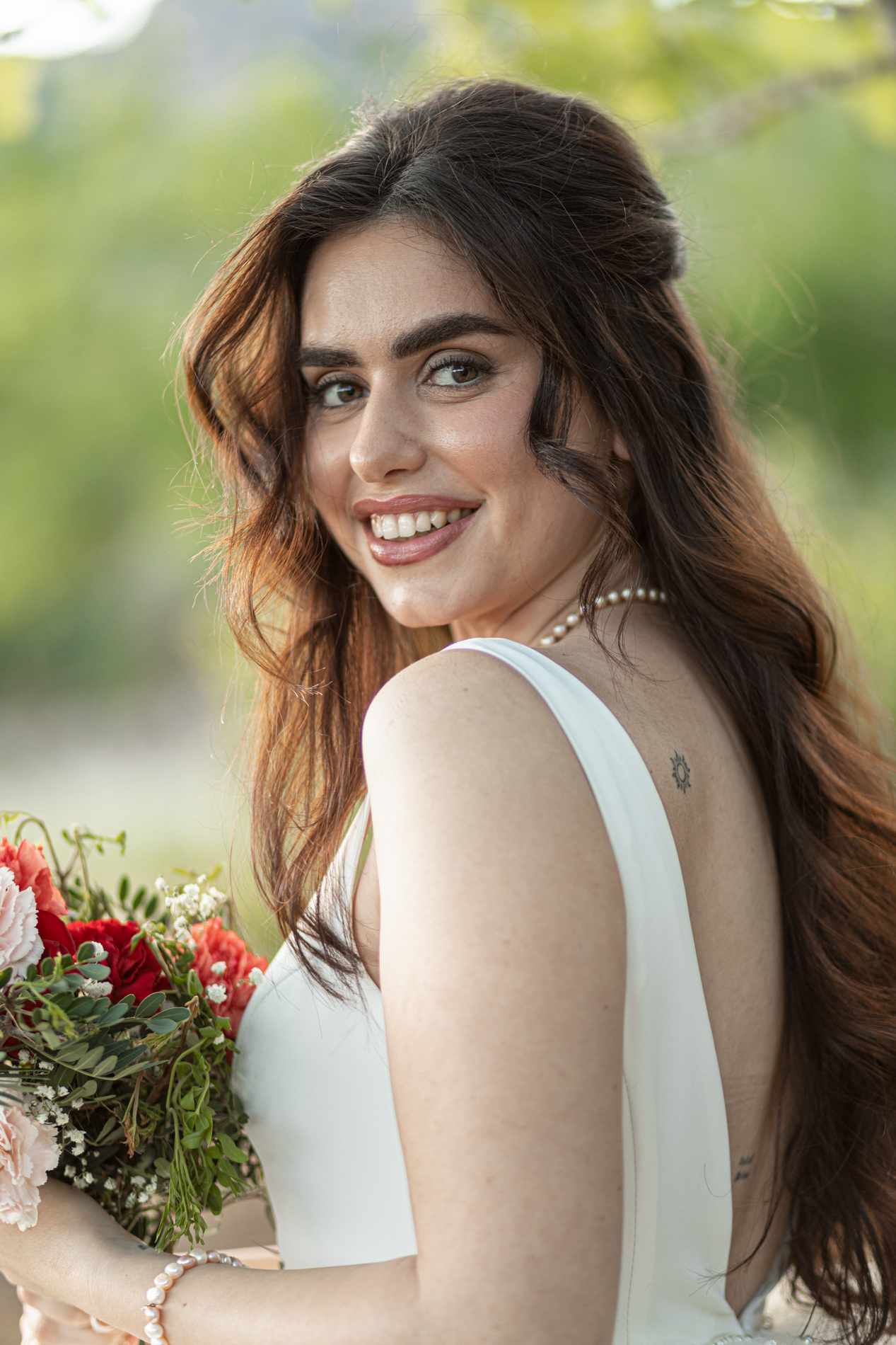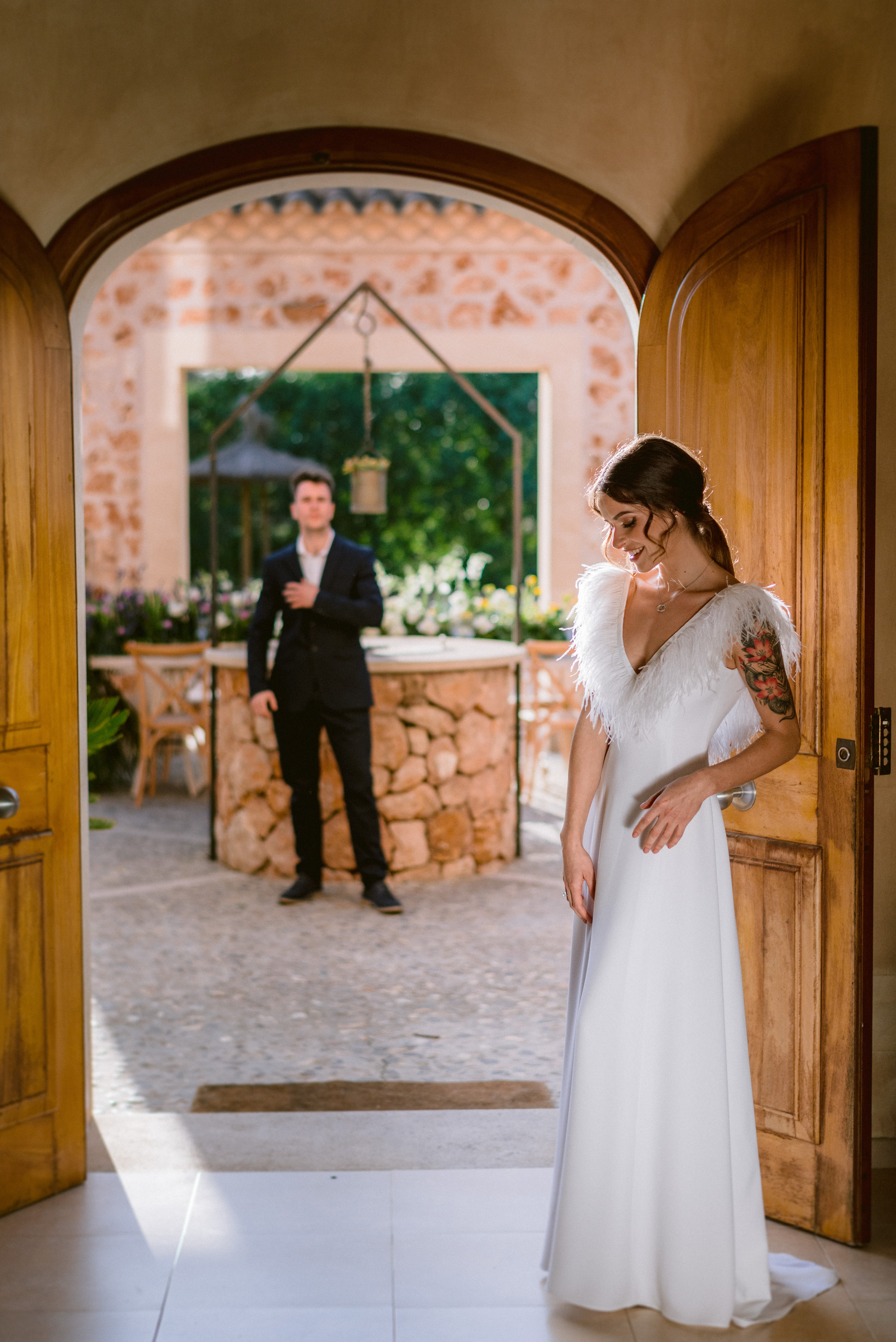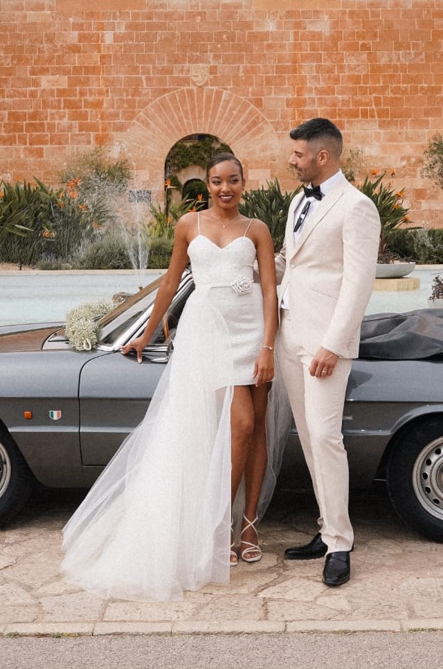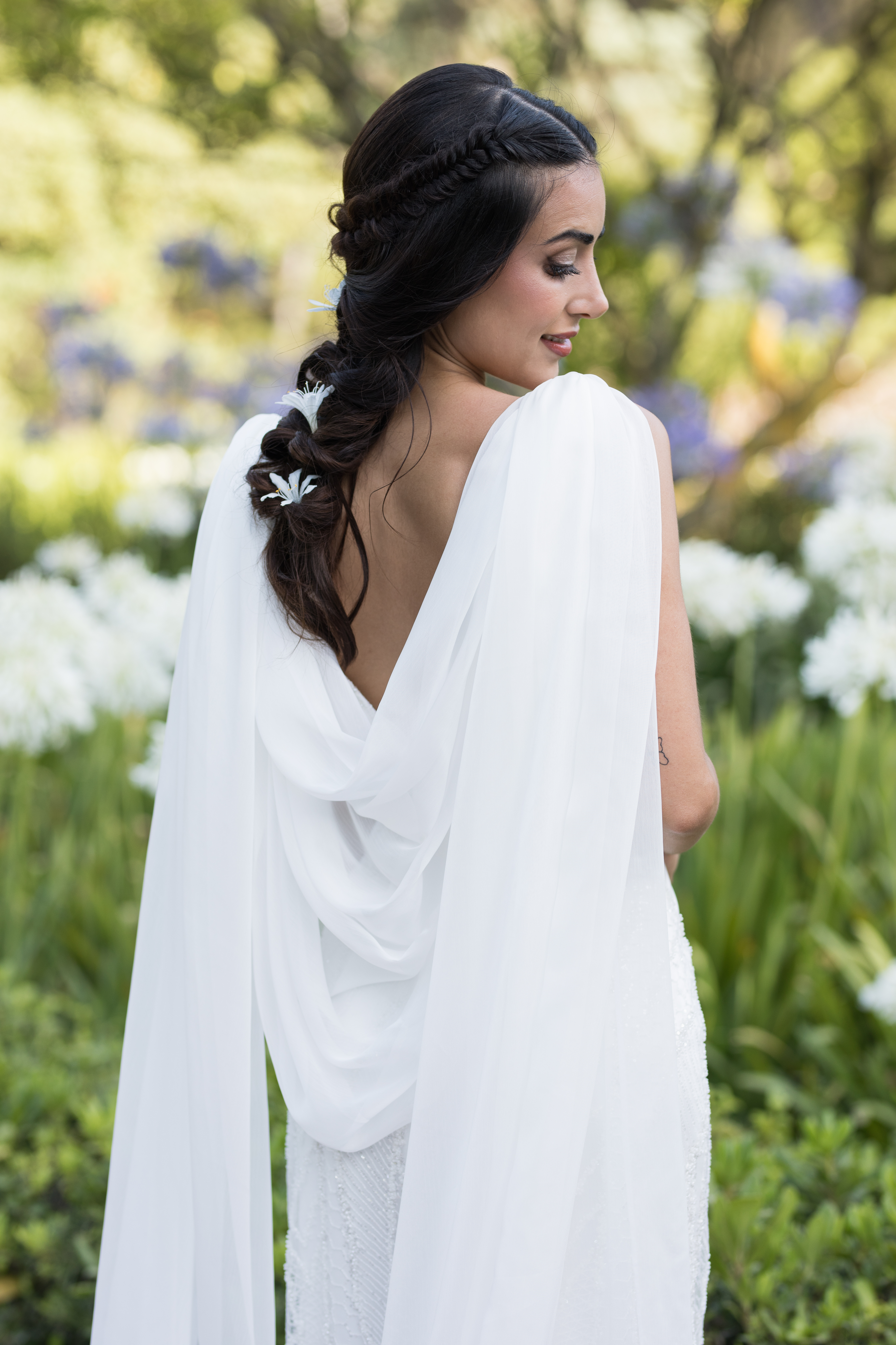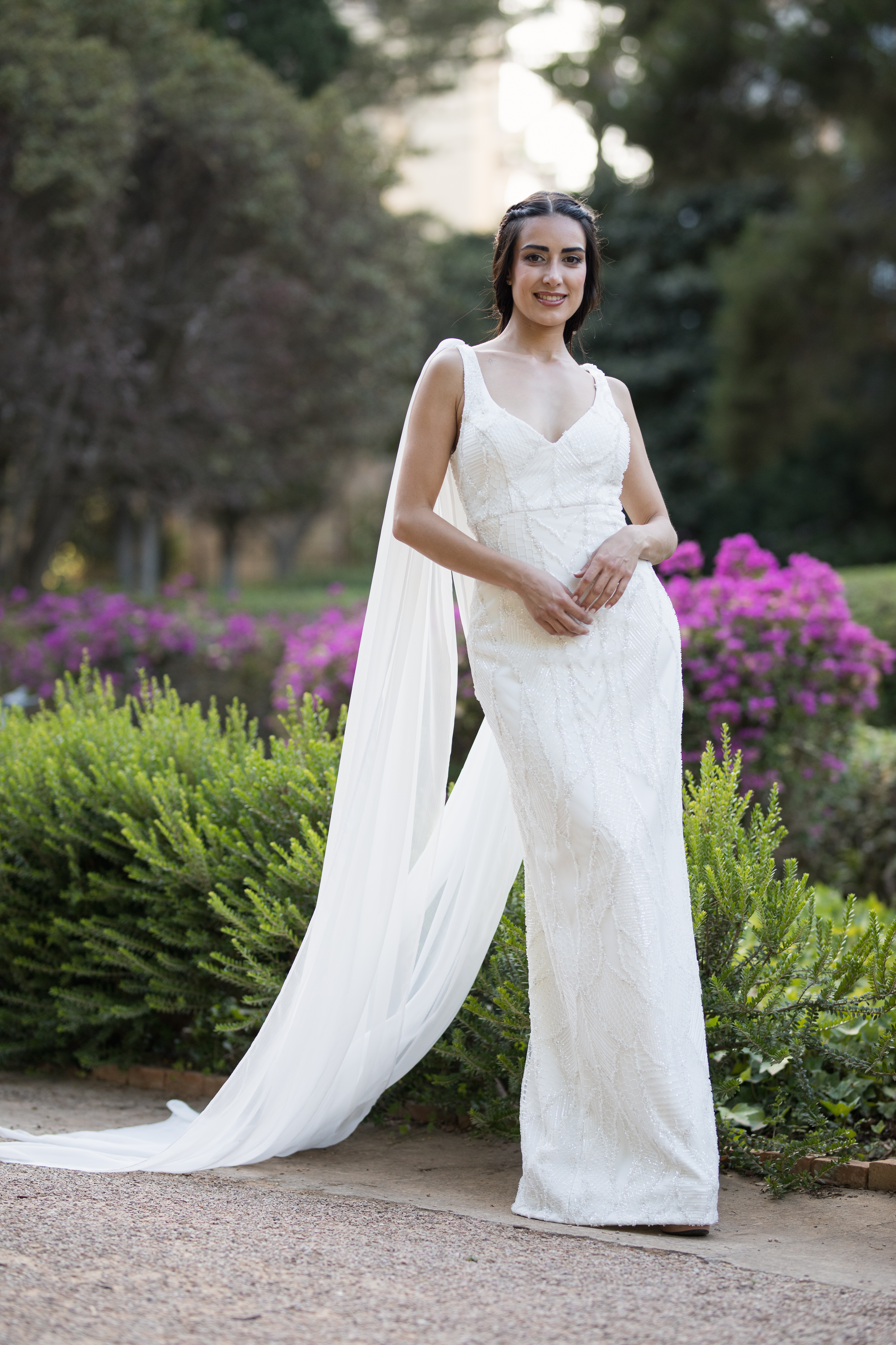 Este exclusivo vestido ajustado de encaje con pedrería envuelve la silueta con un brillo moderno y elegante. La espalda se realza con un precioso drapeado de gasa, que aporta fluidez y un toque de alta costura. Una pieza única para una novia segura, refinada y absolutamente inolvidable.