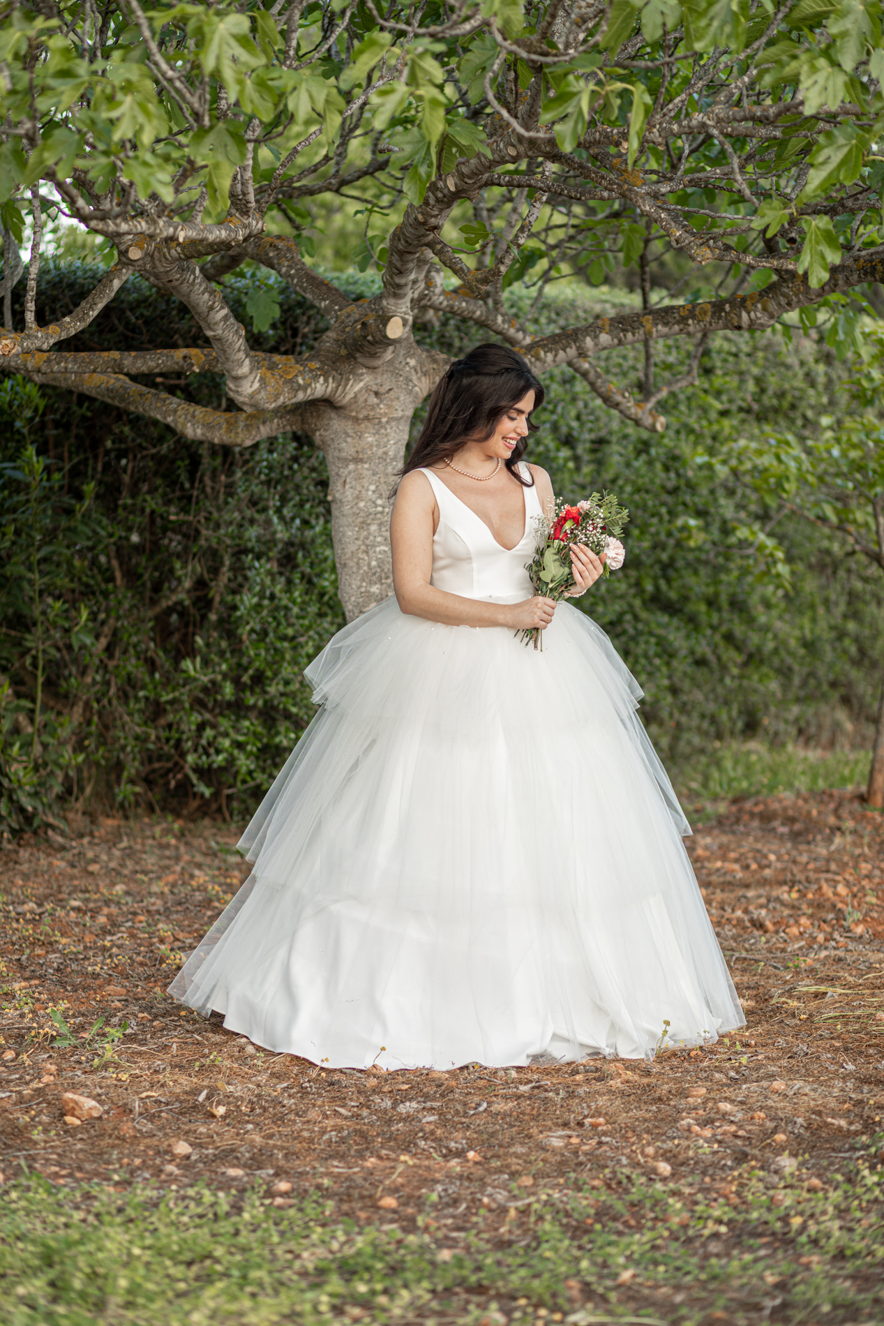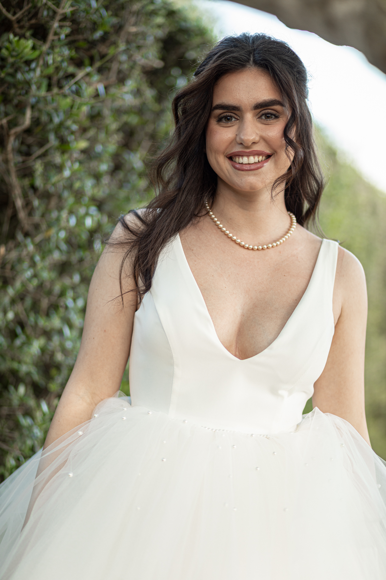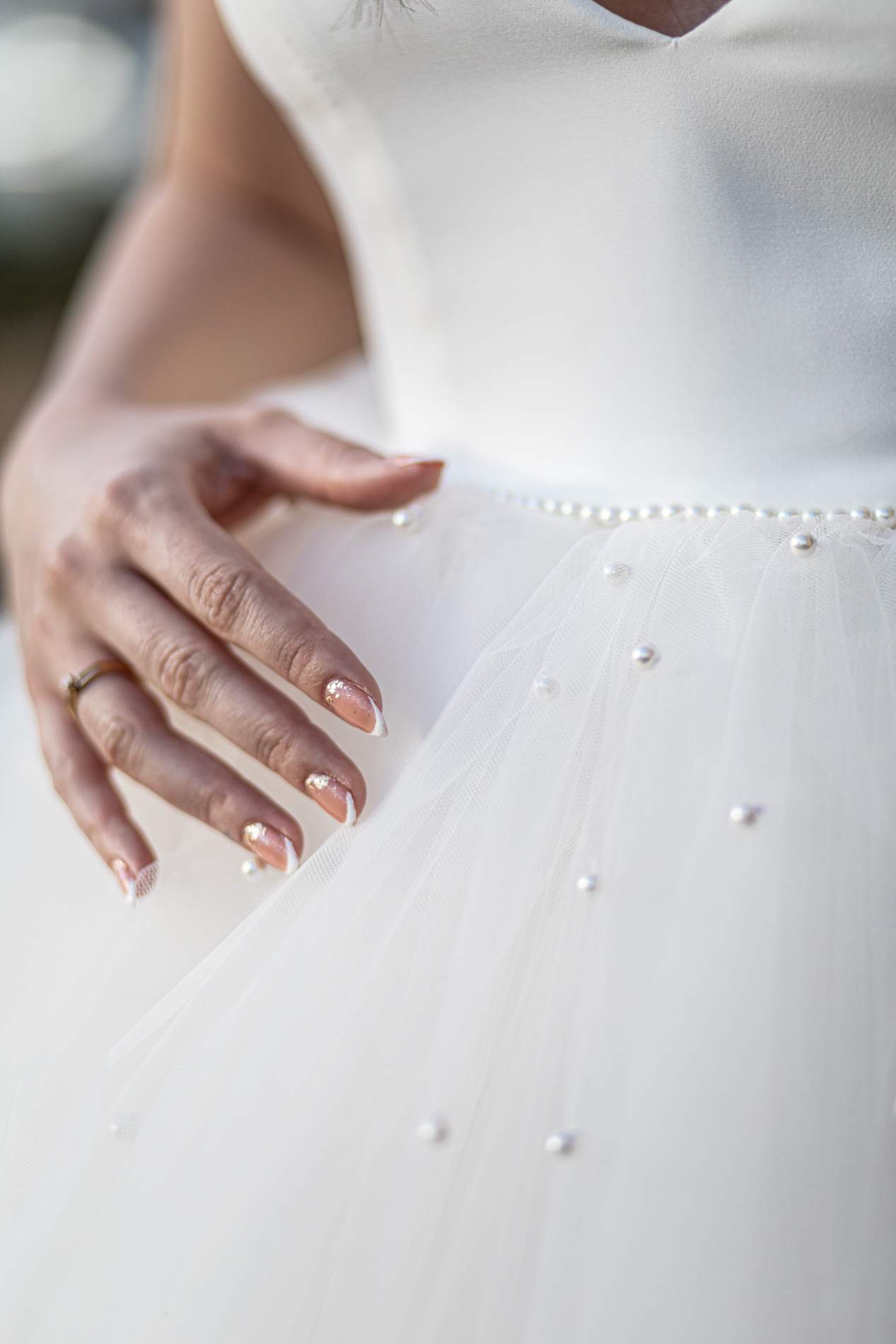 Vestido de novia blanco con cuerpo de crepé y escote en V profundo. Espalda abierta que aporta un toque sexy y elegante. Falda corte princesa con tres capas de tul para un volumen ligero y sofisticado. Cintura bordada con perlas nacaradas que aporta un detalle único y brillante. Perfecto para novias que buscan estilo y frescura.