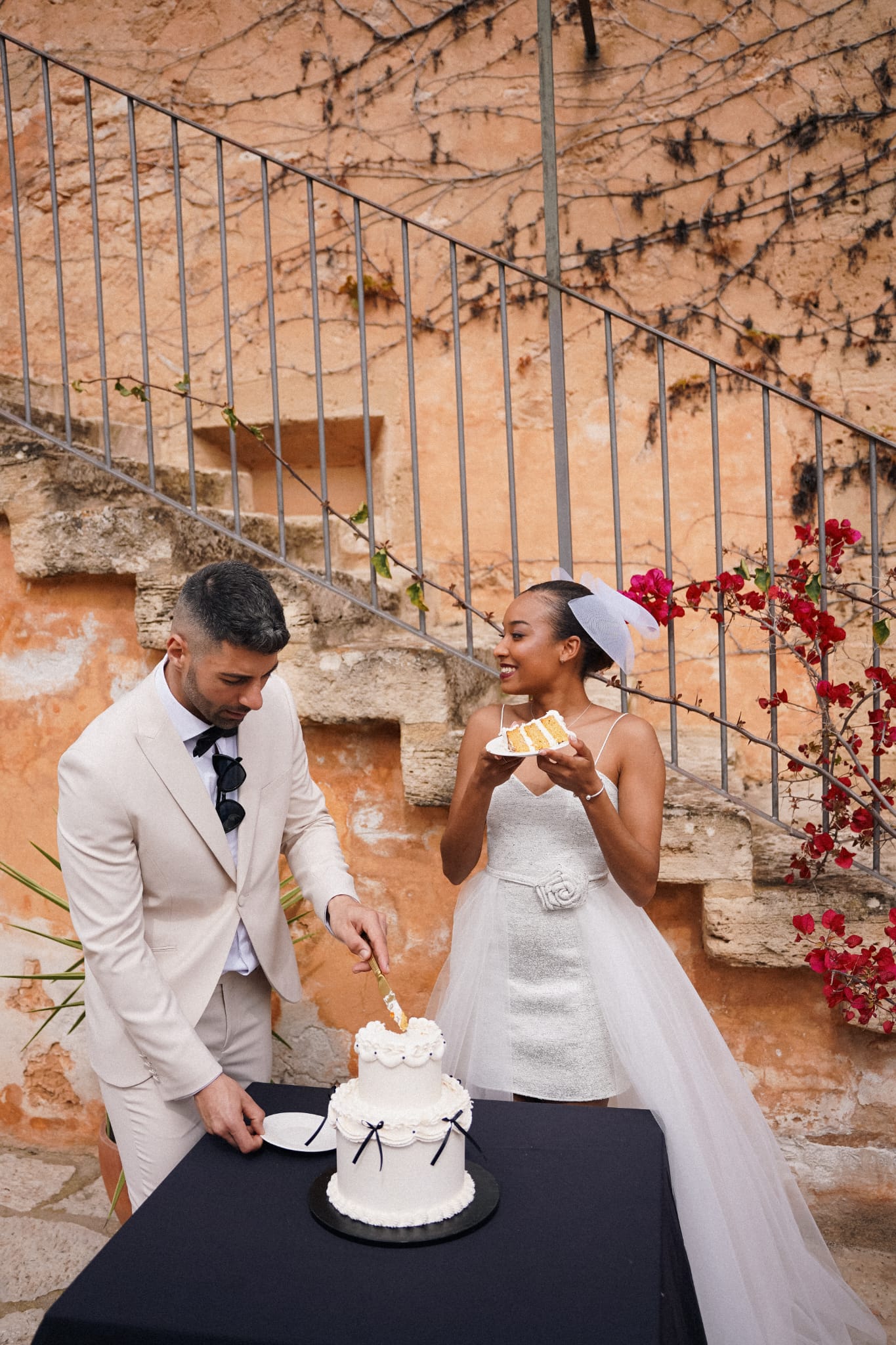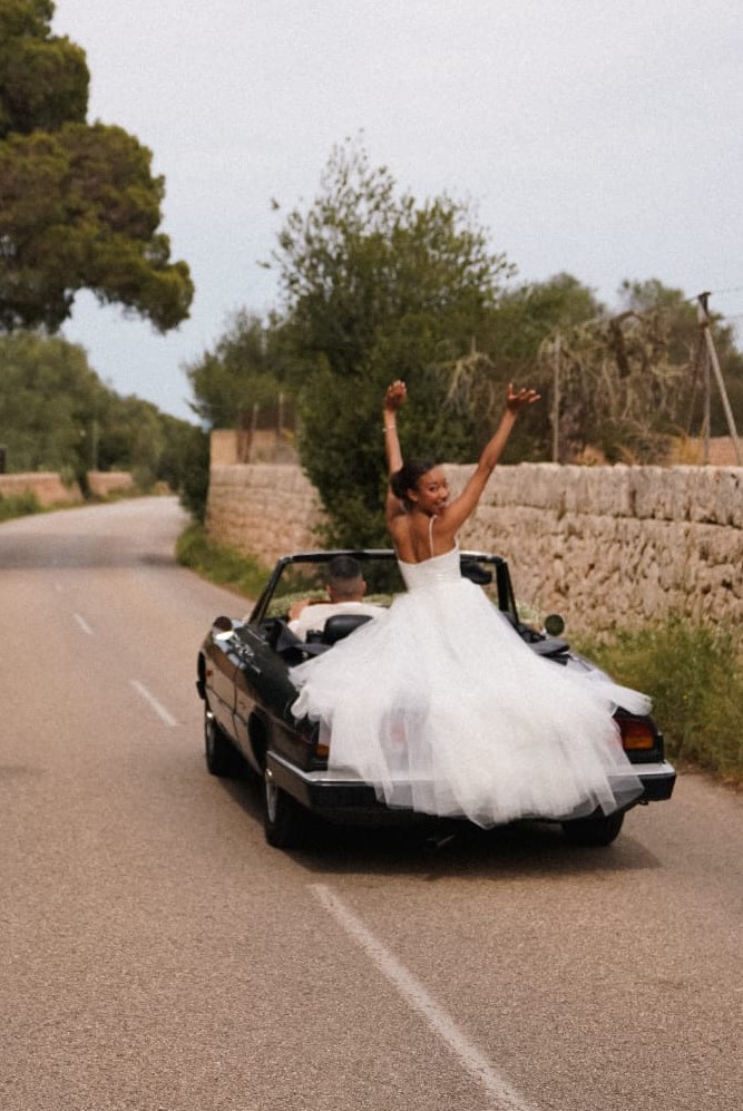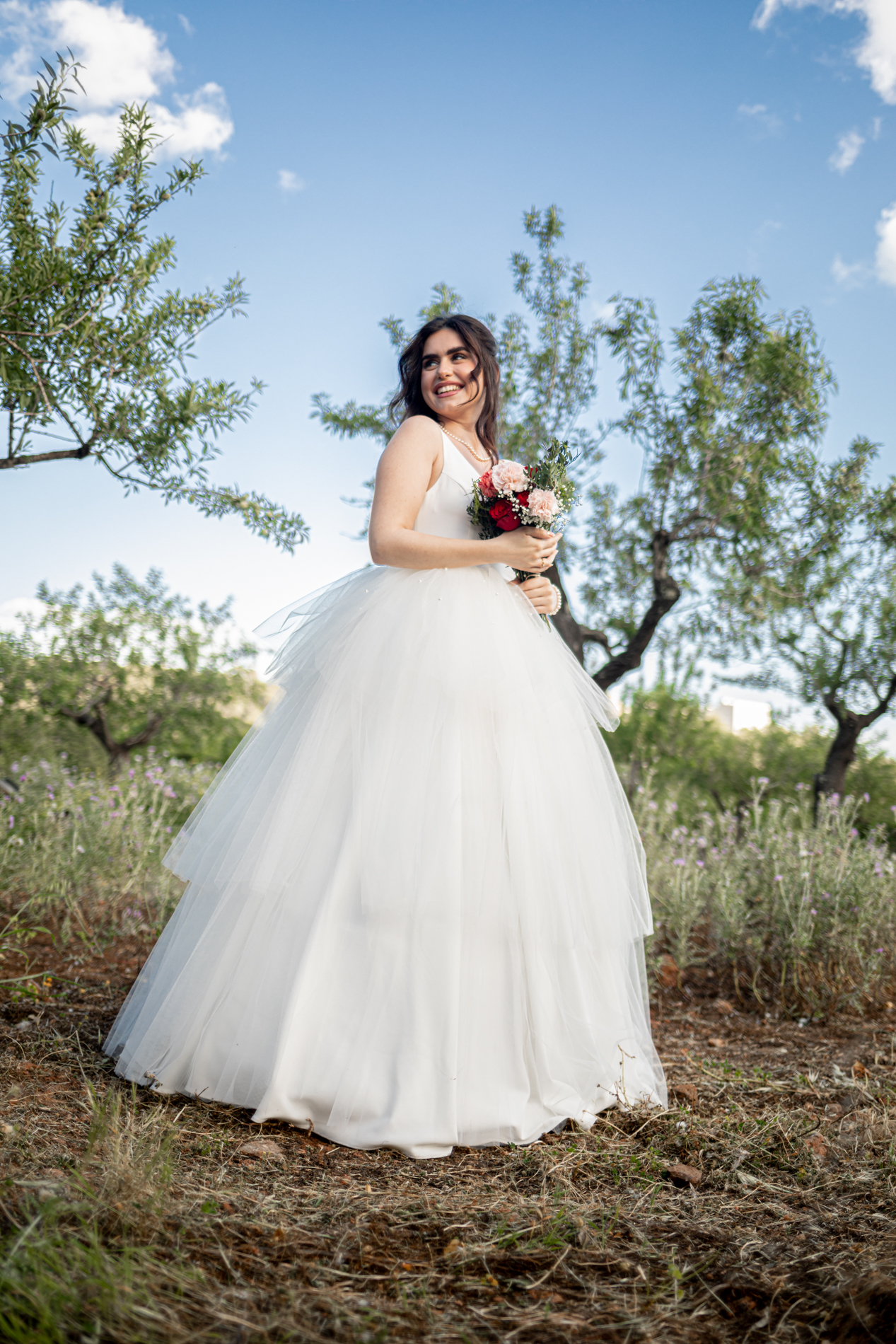 Vestido de novia blanco con cuerpo de crepé y escote en V profundo. Espalda abierta que aporta un toque sexy y elegante. Falda corte princesa con tres capas de tul para un volumen ligero y sofisticado. Cintura bordada con perlas nacaradas que aporta un detalle único y brillante. Perfecto para novias que buscan estilo y frescura.