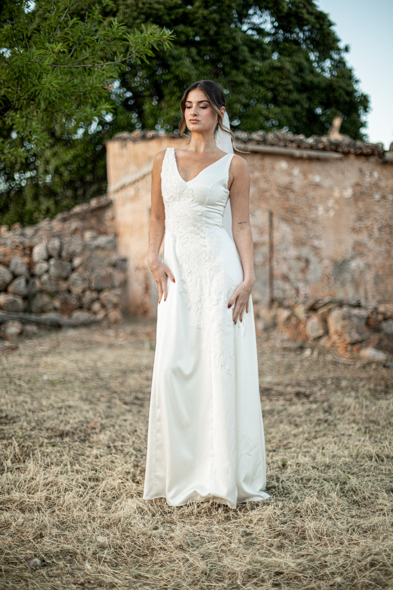 Vestido de novia en satén blanco crudo, con encaje de pedrería cosido a mano en un diseño asimétrico. Escote en pico frontal y posterior que resalta la silueta con delicadeza. Una cola sutil completa esta pieza de alta costura, ideal para una novia sofisticada.